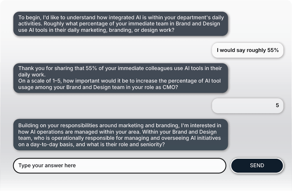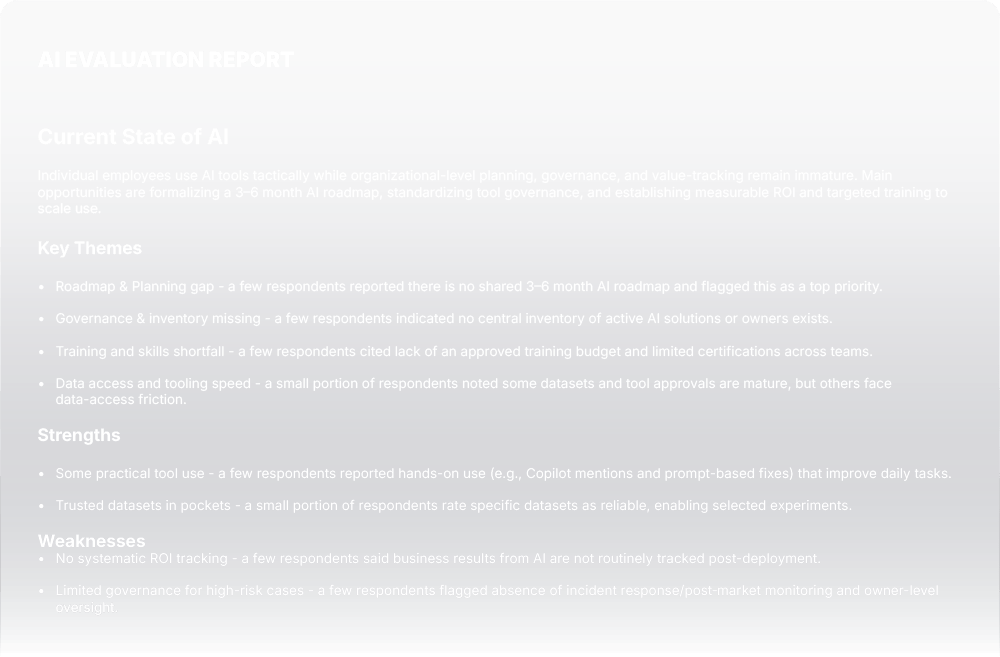 The AI Evaluator is your strategic tool for leadership. Align your executive vision with true organizational readiness and turn the 'complexity of AI' into a focused, path forward.